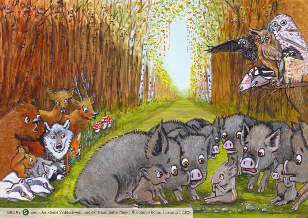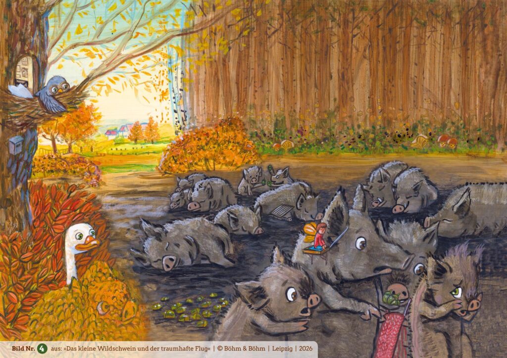Das Kamishibai-Bildkartenset, basierend auf dem fünften Bilderbuch von Böhm & Böhm zeigt, warum das Fliegen selbst für Borstentiere eine gute Idee sein kann.