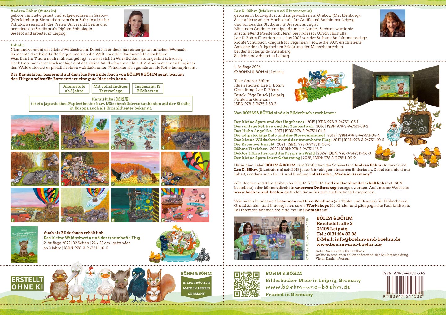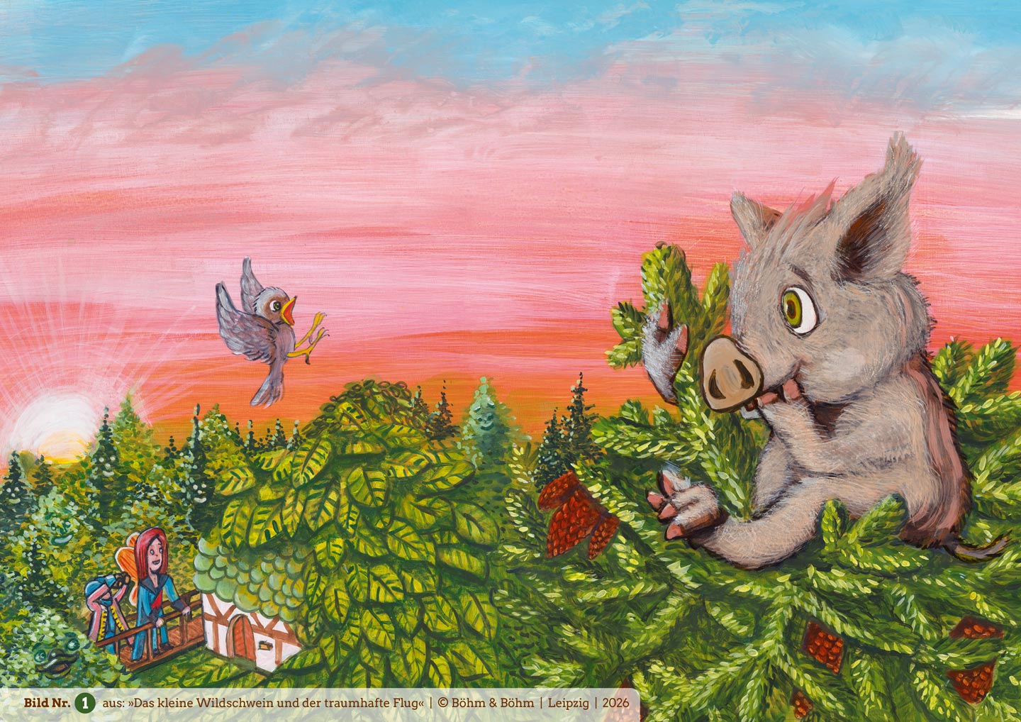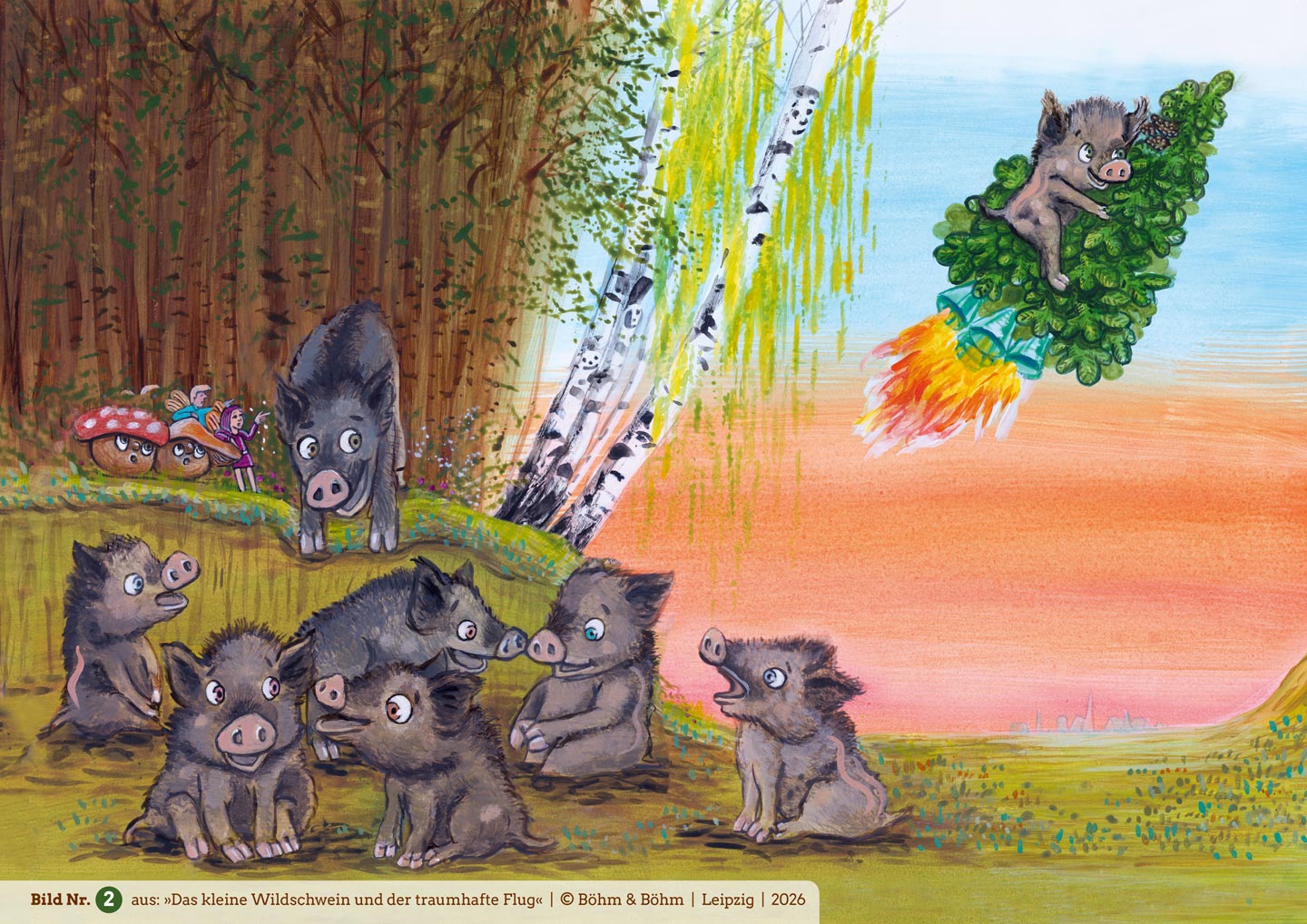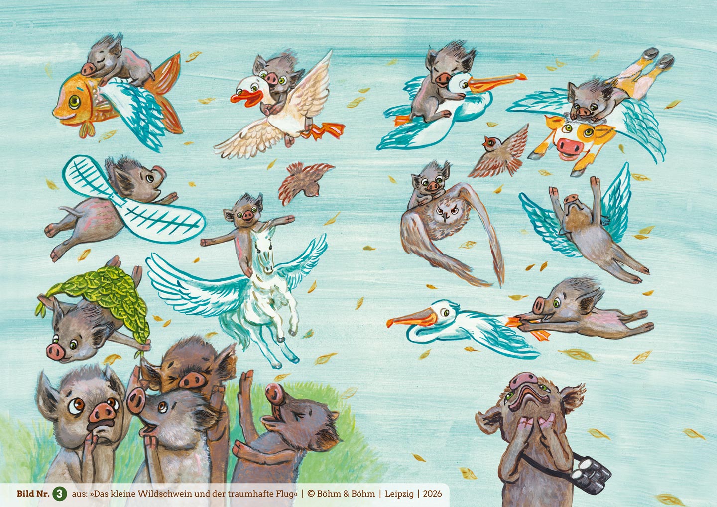Das Kamishibai-Bildkartenset, basierend auf dem fünften Bilderbuch von Böhm & Böhm zeigt, warum das Fliegen selbst für Borstentiere eine gute Idee sein kann.