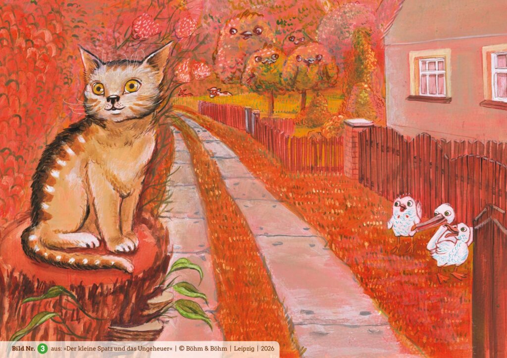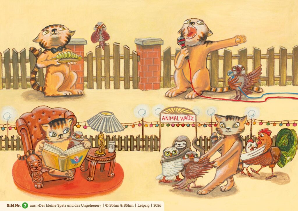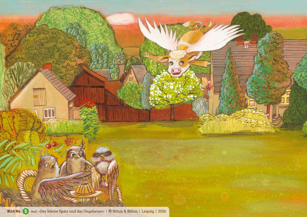 Nur der kleine Spatz hockt noch im Nest und traut sich nicht zu fliegen. Er möchte furchtbar gern, schließlich wartet das große Vogelfest auf ihn. Was aber tun, wenn unter dem Nest ein schreckliches Ungeheuer lauert? Denn die dicke Kuh, die in der Nähe weidet, wartet bestimmt nur darauf, ihn zu verschlingen! Allen Beteuerungen seiner Eltern über die Harmlosigkeit der Kuh schenkt der kleine Spatz keinen Glauben. Er vertraut lieber der hübschen Katze, die versucht, ihn mit List und Tücke aus dem Nest zu locken…