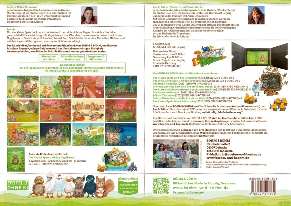 Das Kamishibai-Bildkartenset, basierend auf dem ersten Bilderbuch von Böhm & Böhm erzählt von falschen Ängsten, echten Gefahren und der (über-)lebenswichtigen Fähigkeit, zu unterscheiden, wer Böses im Schilde führt und wer es gut mit einem meint.