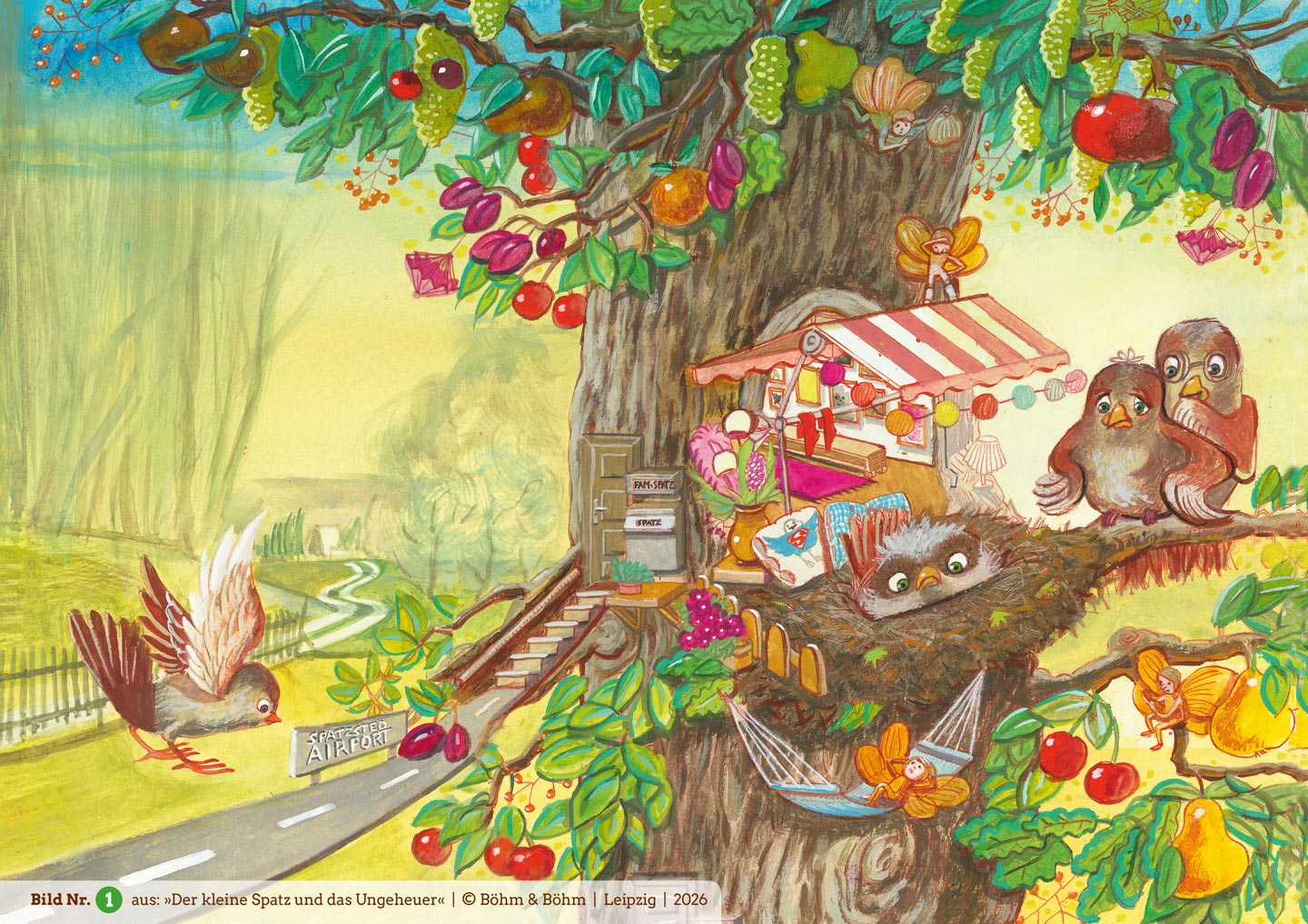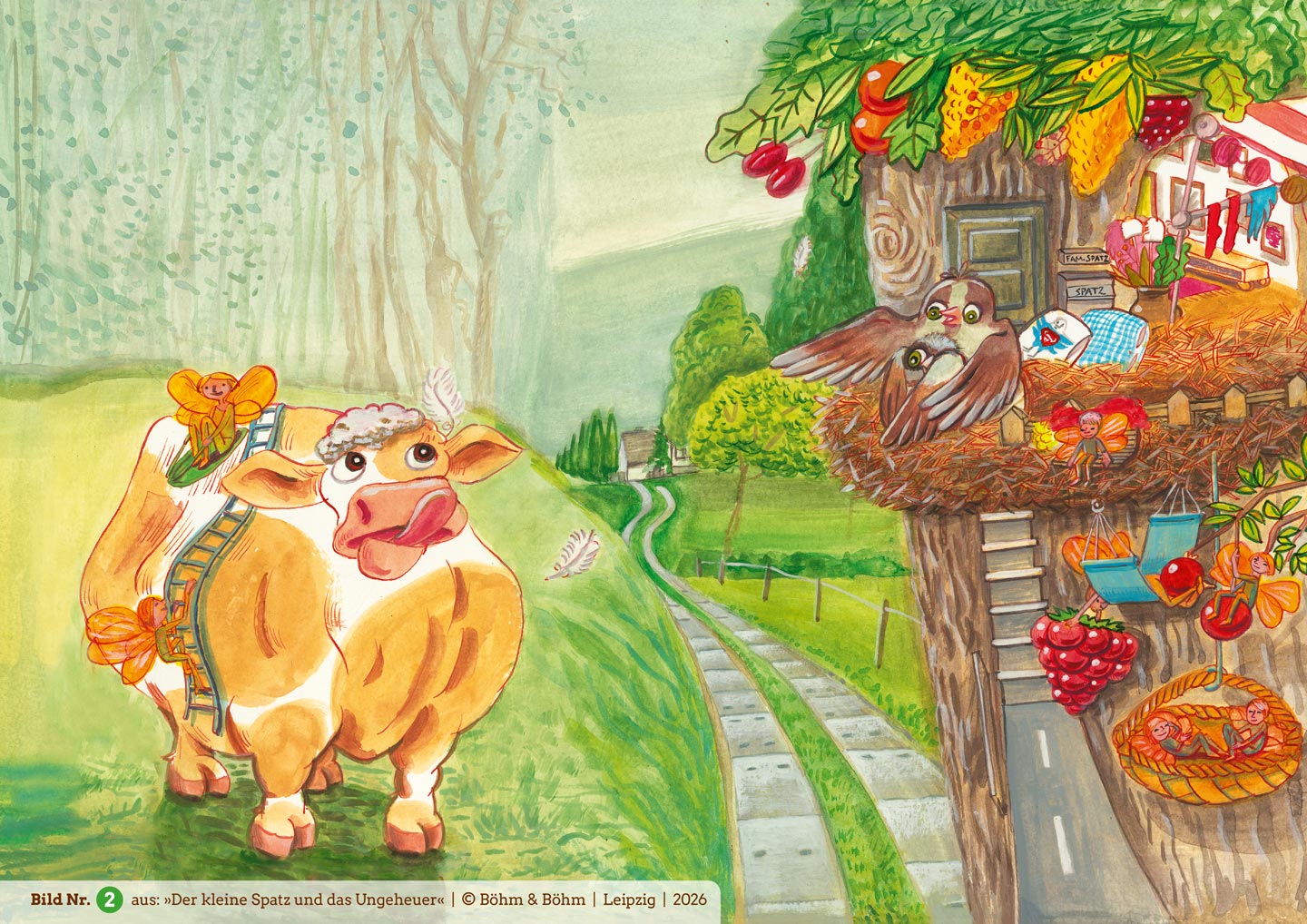 Nur der kleine Spatz hockt noch im Nest und traut sich nicht zu fliegen. Er möchte furchtbar gern, schließlich wartet das große Vogelfest auf ihn. Was aber tun, wenn unter dem Nest ein schreckliches Ungeheuer lauert? Denn die dicke Kuh, die in der Nähe weidet, wartet bestimmt nur darauf, ihn zu verschlingen! Allen Beteuerungen seiner Eltern über die Harmlosigkeit der Kuh schenkt der kleine Spatz keinen Glauben. Er vertraut lieber der hübschen Katze, die versucht, ihn mit List und Tücke aus dem Nest zu locken…